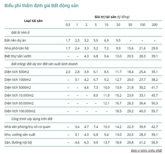 Biểu phí thẩm định giá nhà đất sẽ được tính toán dựa trên loại hình bất động sản, diện tích bất động sản, và mục đính sử dụng của bất động sản đó. Mức phí có thể giao động từ vài triệu đến vài chục triệu.