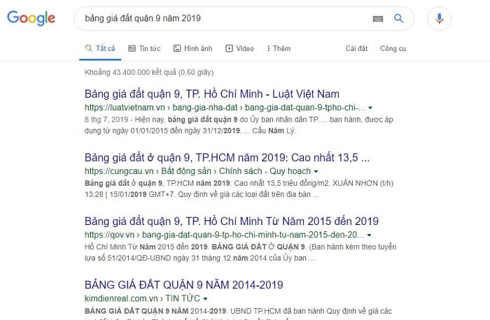 –Bảng giá đất theo Nhà nước:Là tập hợp các mức giá đất cho mỗi loại đất do UBND cấp tỉnh ban hành trên cơ sở phương pháp xác định giá đất và khung giá các loại đất. Bảng giá đất này sẽ được ban hành mỗi 5 năm một lần và công bố vào ngày 01 tháng 01 của năm đầu kỳ. Cái này bạn có thể lên mạng và tìm kiếm theo từ khóa “bảng giá đất + khu vực mà bạn cần tìm”. VD: Tôi cần tìm giá nhà đất quận 9 thì tìm như sau “Bảng giá đất quận 9 năm 2019” là sẽ ra ngay kết quả như hình bên dưới.